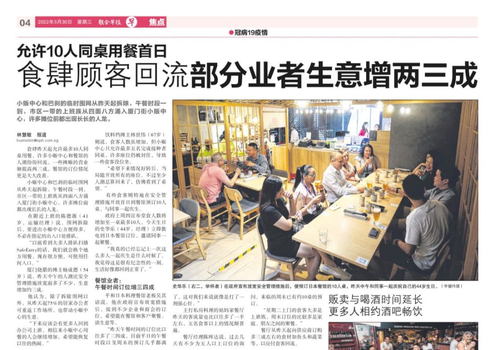 We are glad to be interviewed by Zao Bao on the resumption of 10 pax dine in. With the increase in number of dine in per table, we are seeing a slow increase of 30% of diners returning to the restaurant.
